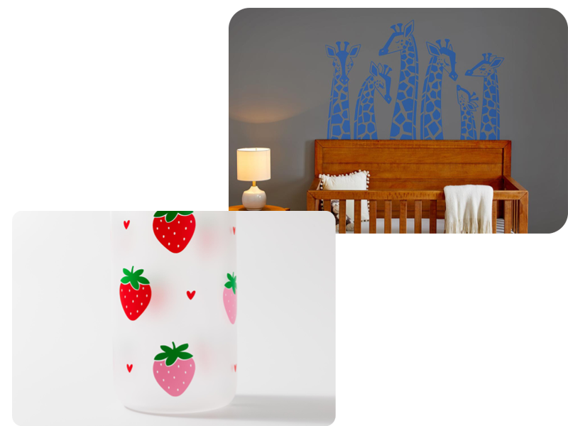 - *الفينيل الدائم: فينيل لاصق(خامة تشبه التجليد) يستخدم مع الأكواب و المرايا والخزف و الجبس والديكورات الجدارية يتميز انه دائم يعني قوة التصاقه قوية ومناسب للاستخدامات الخارجية او على الاسطح اللي تتعرض للبلل مثل الاكواب.