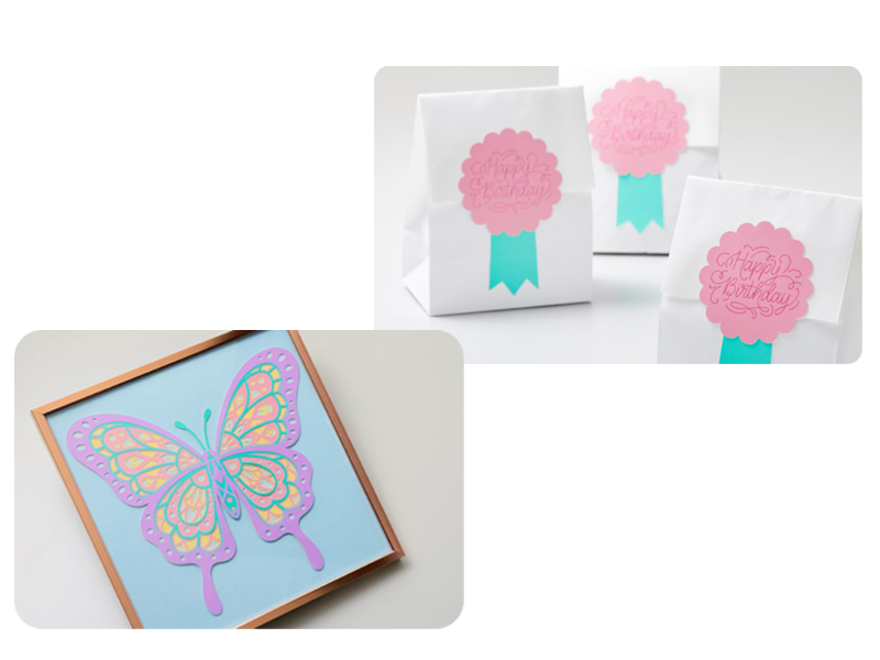 - كريكت ميكر 3 يتعامل مع أكثر من 300 خامة: اي نعم، مو بس ورق وفينيل. الجهاز هذا يقدر يقص على الجلد، القماش، الخشب الخفيف، وينقش لك عالأكريليك بعد 😍.. وغيرها الكثير يعني عندك حرية اختيار من أكبر تشكيلة خامات ممكنة. وهذي امثلة لمشاريع بالخامات المعروفة :